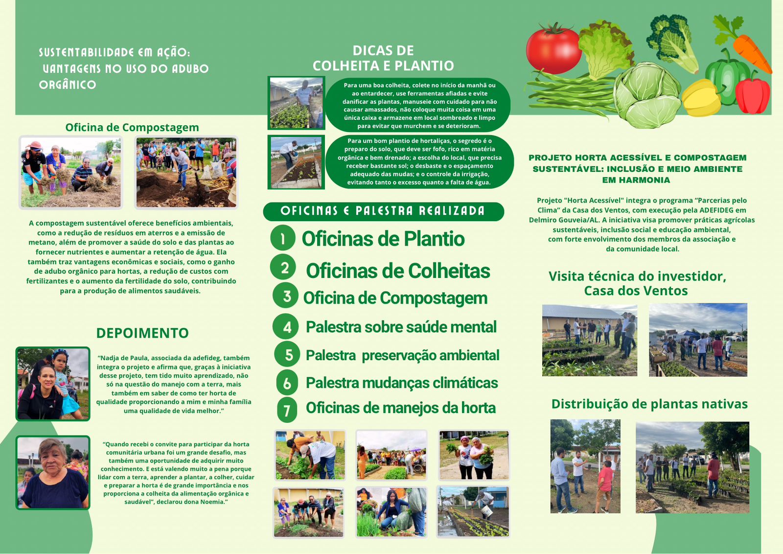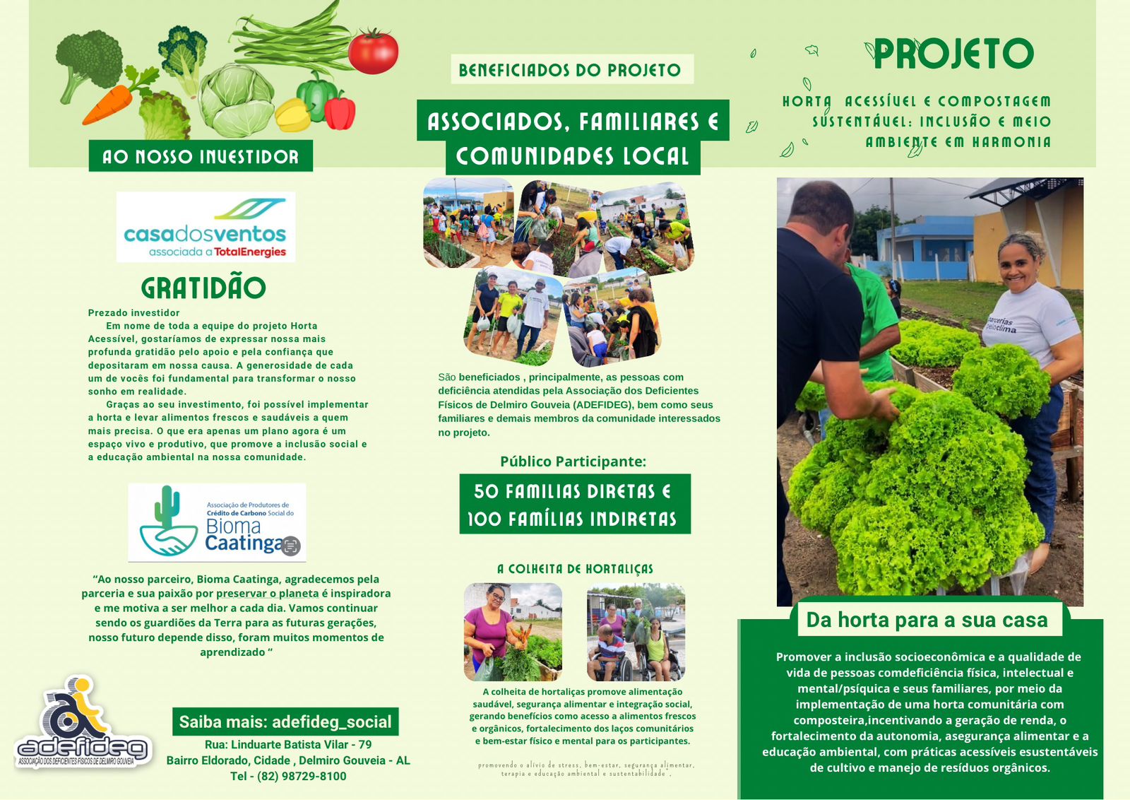 O Projeto Horta integra o programa “Parceiros pelo Clima” da Casa dos Ventos, com a execução pela ADEFIDEG e, Delmiro Gouveia- A. A iniciativa visa promover práticas agrícolas sustentáveis, inclusão social e educação ambiental, com forte envolvimento dos membros da associação e da comunidade local.